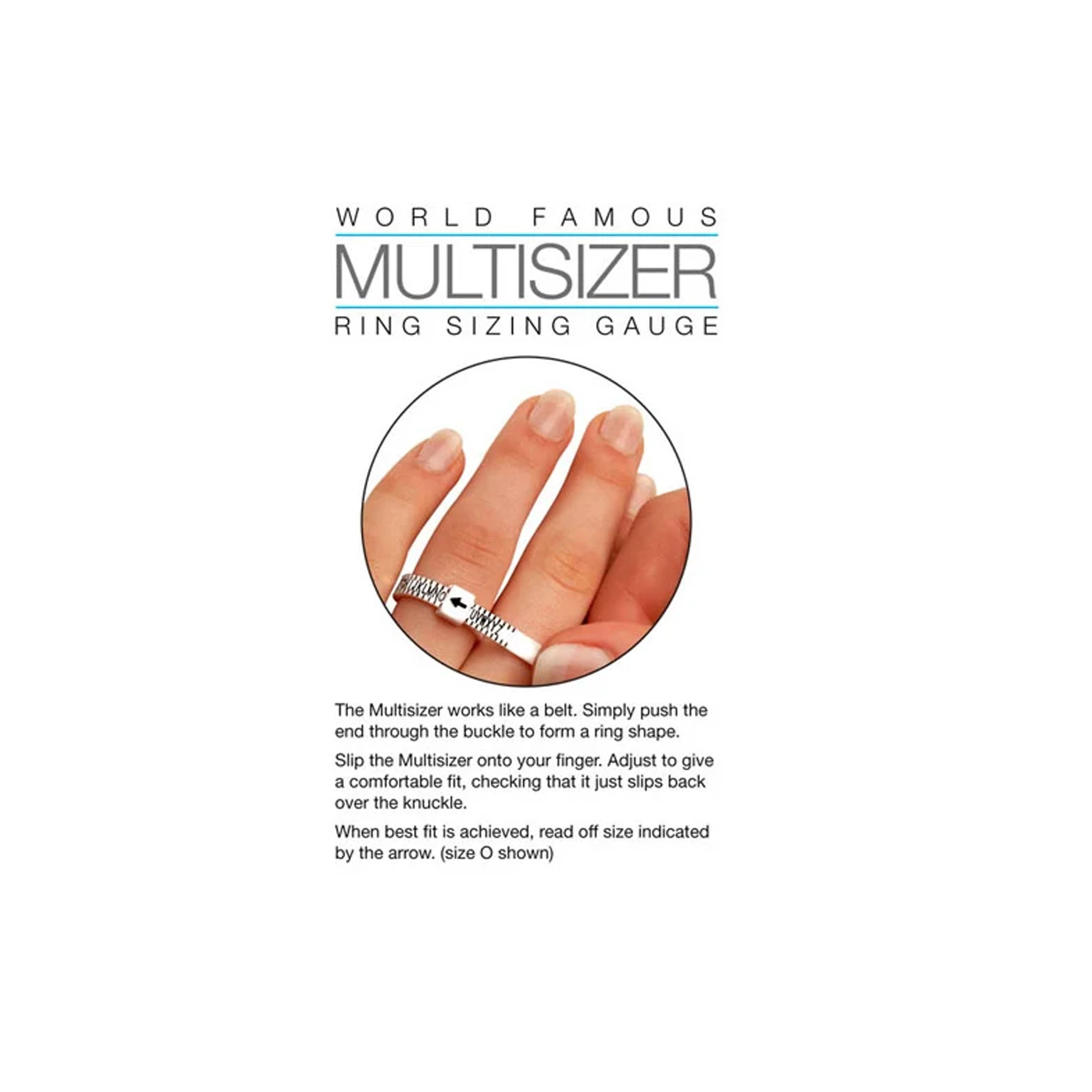 Are you unsure what ring size to order? Dont panic, we can help. This clever little ring sizer works like a belt. Simply push the end through the buckle to form a circle.  Then slip the Multisizer onto your finger and adjust it to give a comfortable fit. Its very important to make sure it slips back over the knuckle.  Once you have found your perfect fit, you can read the size indicated by the arrow.